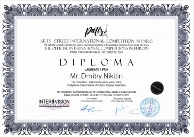 Талантливый студент Челябинского института культуры и искусств Дмитрий Никитин награжден Второй премией Международного конкурса «Vali ARTS – STREET» в Париже. Музыкант стал одним из лучших в номинации инструментального жанра в игре на фортепиано. Его сольное исполнение произведения Роберта Шумана «Карнавал» позволило признать музыканта Лауреатом Второй Премии престижного конкурса.