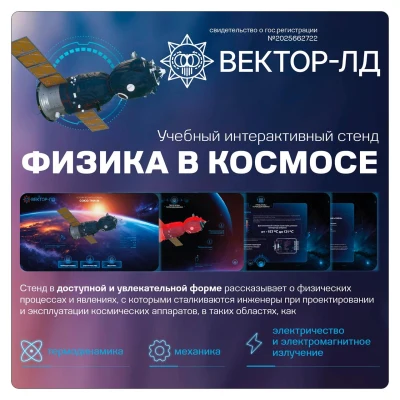 — Второй экспонат, который мы хотим показать, это наша новинка, в какой-то степени даже загадка – интерактивный стенд «Физика в космосе». Но это не просто образовательный продукт, а настоящее произведение искусства в сфере обучения. Он представляет собой программное обеспечение, прошедшее государственную регистрацию, которое может использоваться как в обычных, так и в профильных, инженерных и космических классах.
