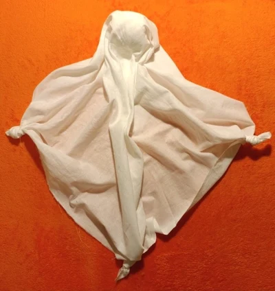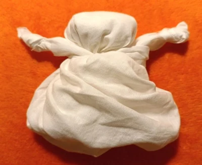 Берем квадрат ткани белого цвета, на трёх концах платка туго затягиваем узелки.