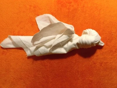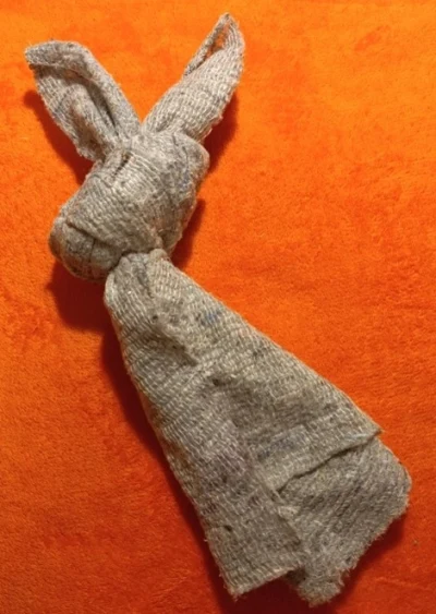 Делаем узел наверху – формируем голову и ушки. Завязываем ткань снизу, под шеей, формируем туловище, вытягиваем хвост. Зайчик готов!