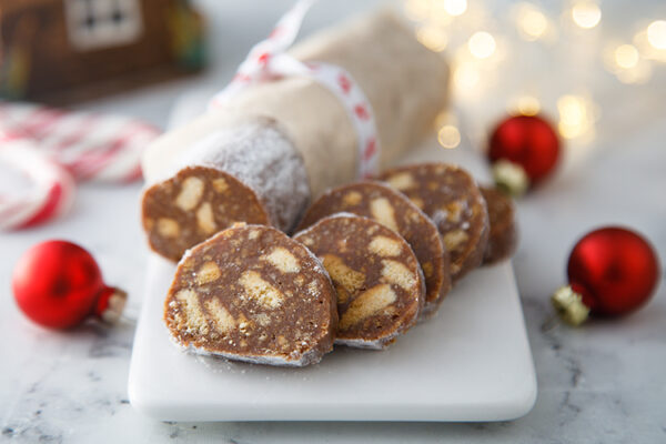 Просто соедините мягкие ломтики печенья с маслом, сгущенкой и какао. Половина печенья перемалывается в блендере, другая половина – ломается ломтиками. Сформируйте аккуратные колбаски и отправьте их в холод для застывания. Завершающим штрихом станет щедрая посыпка сахарной пудрой. Для приготовления двух колбасок понадобится: 240 г мягкого печенья (сахарного), 180 г сгущенного молока (невареного), 100 г сливочного масла, 1½ ст. л. какао-порошка.